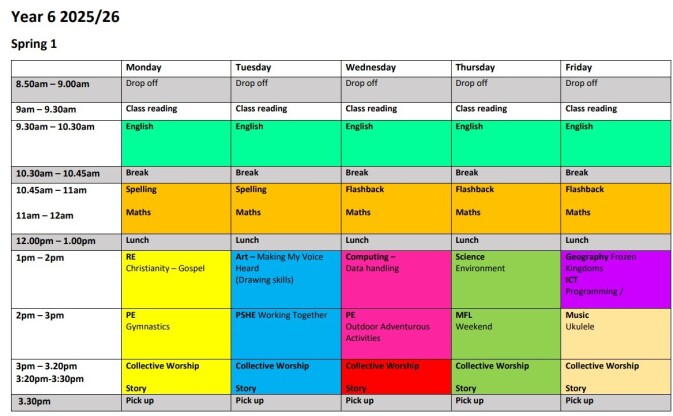 This half term Class 6 will be doing PE on Mondays and Wednesday. Monday will be indoor PE and Wednesday outdoor. Please could children come into school in their PE kits those days. PE kits should be unbranded with a yellow school t-shirt and dark coloured top and trousers. No football kits please.