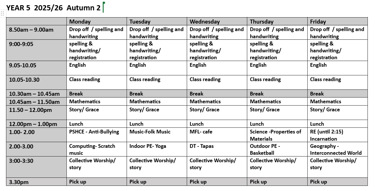 We are delighted to welcome you and your child to Year 5. This is an exciting stage in their learning journey, where independence, responsibility and curiosity truly begin to shine. Over the year, children are encouraged to challenge themselves, think critically and develop greater confidence both inside and outside the classroom. We place a strong emphasis on teamwork, respect and kindness, helping children to grow not only academically but also socially and emotionally- all underpinned by our school motto 'Do Everything in Love.'