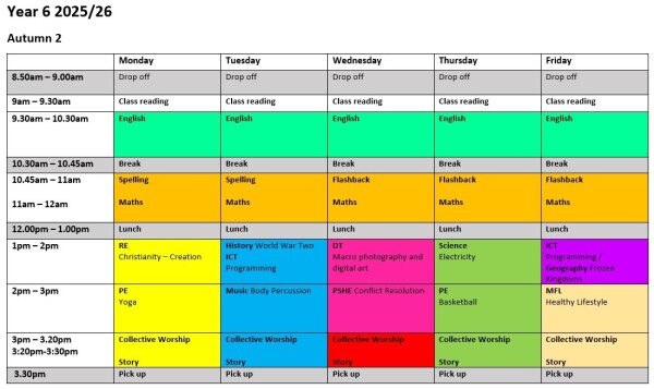 This half term Class 6 will be doing PE on Mondays and Thursday. Monday will be indoor PE and Thursday outdoor. Please could children come into school in their PE kits those days. PE kits should be unbranded with a yellow school t-shirt and dark coloured top and trousers. No football kits please.